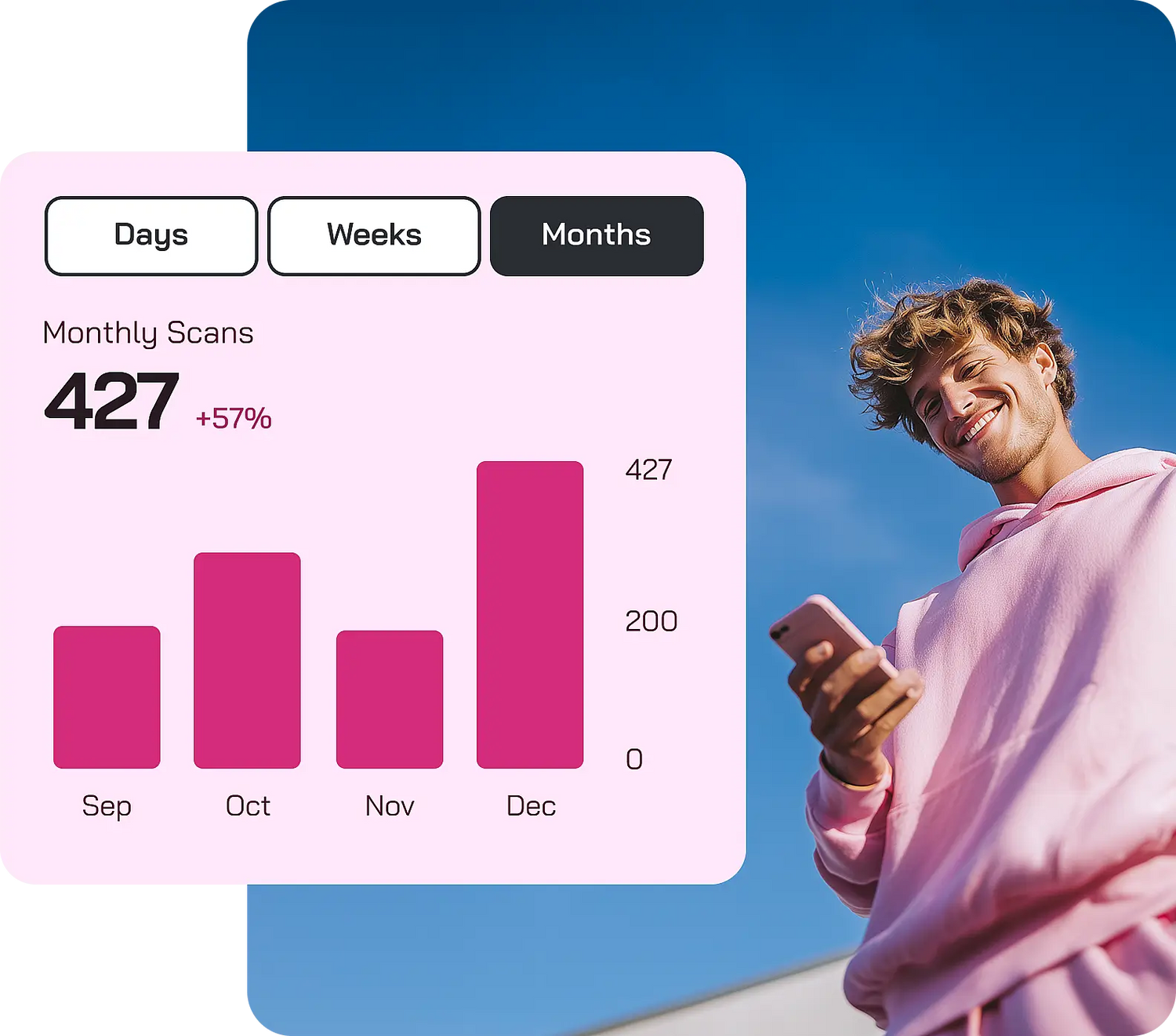 Every scan tracked in real-time in your personal dashboard. Know when, where, and how often people engage with your QRsona.