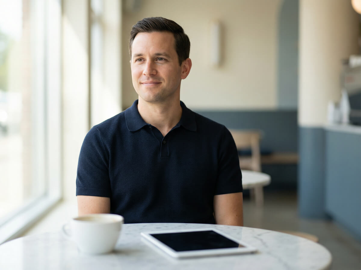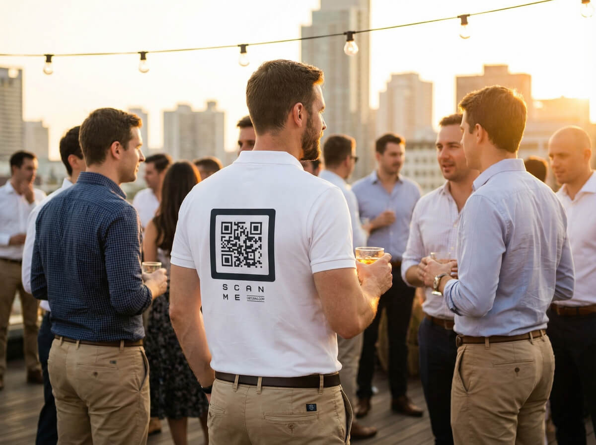 Clean navy polo, professional impression. Your QR links directly to your pitch deck. They scan before the check arrives, review it on the way home.